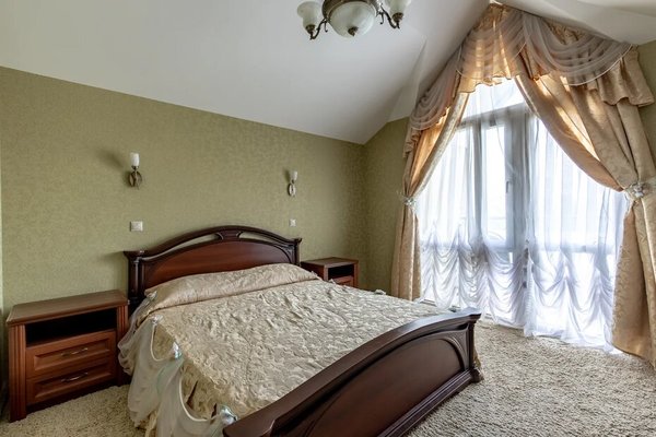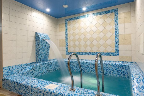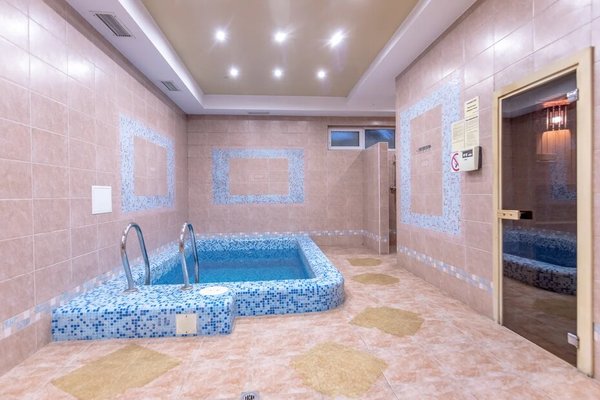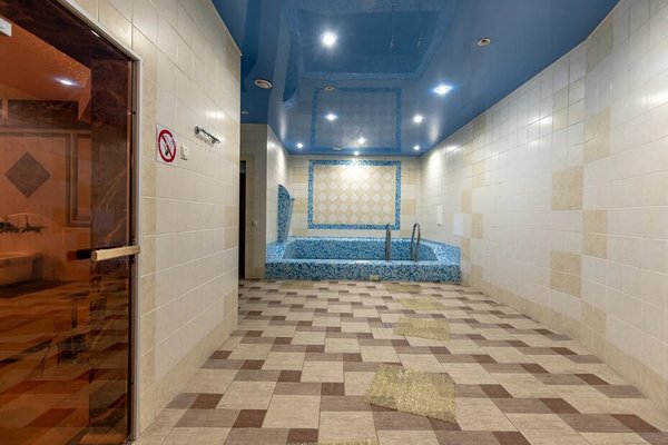 На первом этаже расположен открытый подогреваемый бассейн. А так же сауна и хамам с отдельными зонами отдыха.