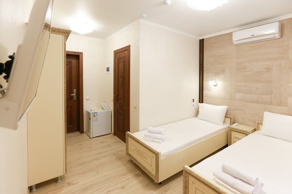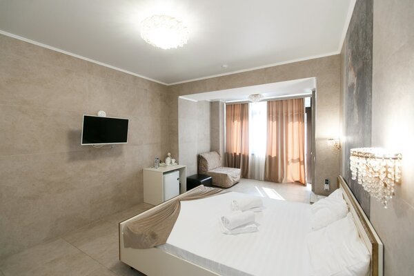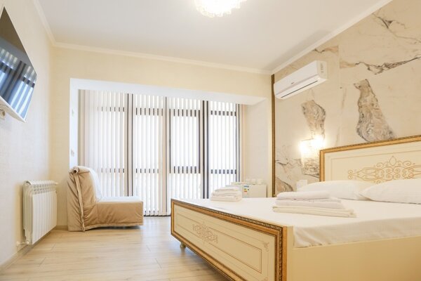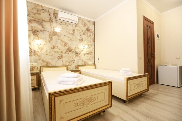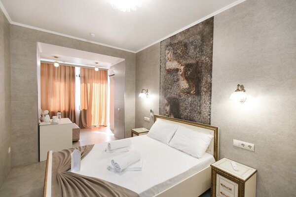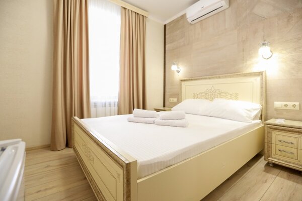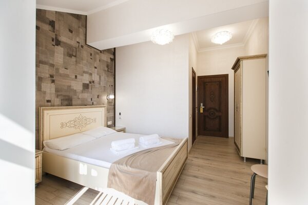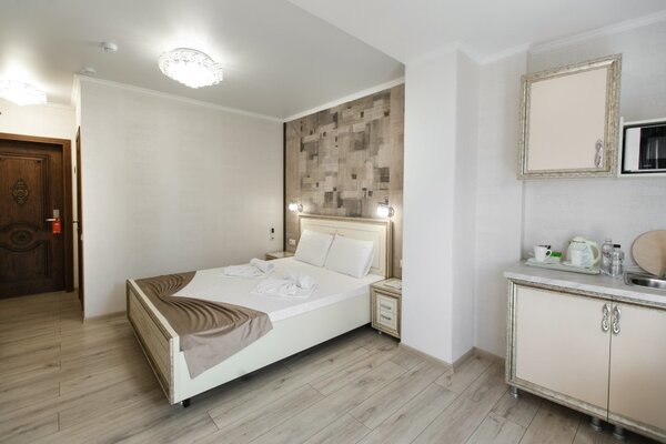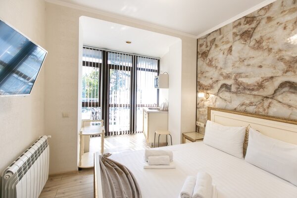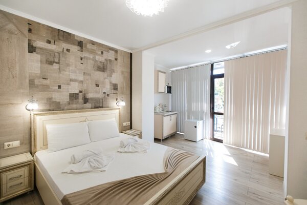В отеле предлагается 70 номеров различных категорий: Стандарт, Комфорт и Студии с мини-кухнями. Все номера оформлены в светлых тонах, гармонично сочетающих классический стиль и минимализм. Выбирайте двух-, трех- или четырехместные номера, чтобы провести отпуск в комфорте и уюте.