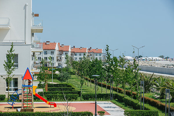 Каждый двор оснащен детскими и спортивными площадками, бассейнами и местами для отдыха. Также, здесь есть детская комната с аниматорами, консьерж-служба, несколько магазинов, кафе, итальянская джелатерия и даже квеструм.