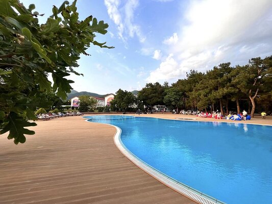 В течение дня на территории здравницы можно пользоваться бассейном, джакузи, тематической детской площадкой, пляжем и волейбольной площадкой!