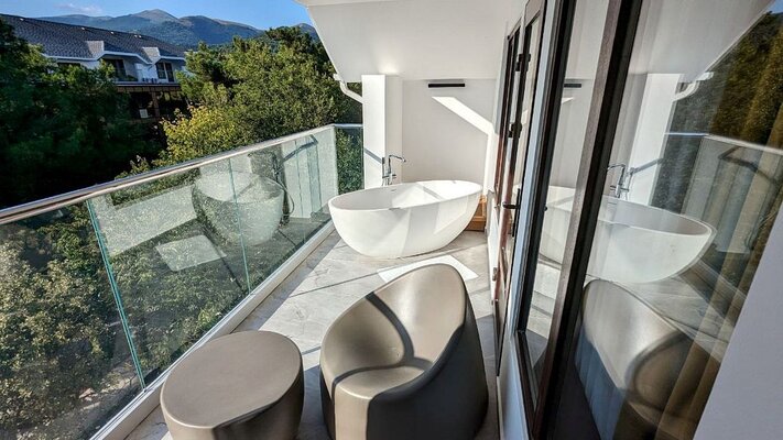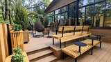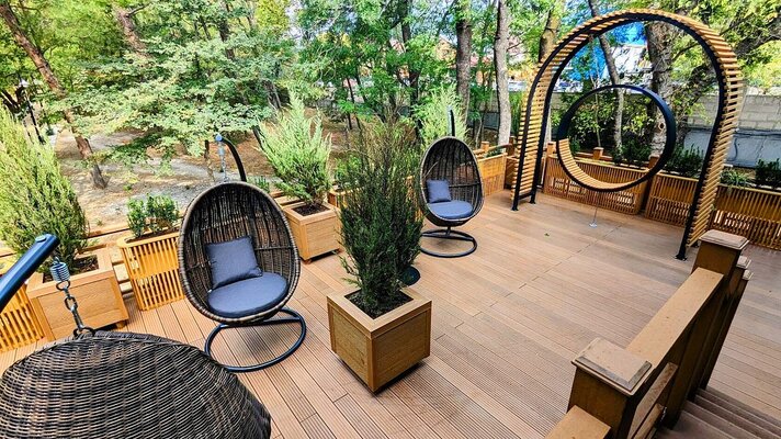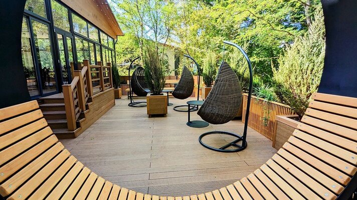 Вокруг бассейна выложена уличная терраса, оборудованная удобными шезлонгами, а вся территория выложена современным и практичным древесно-полимерным материалом.