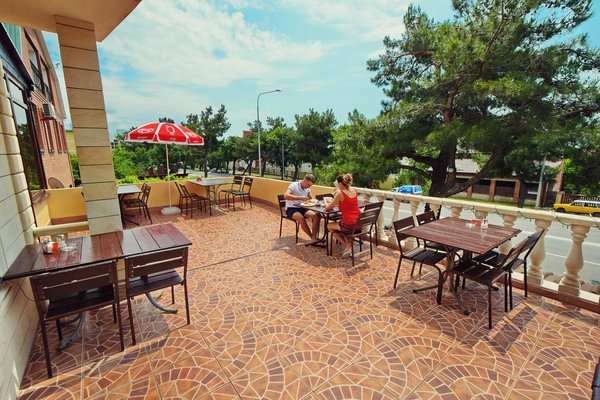 В корпусе есть кафе, а во дворе оборудована летняя площадка питания с барбекю. Рядом с отелем есть продуктовый магазин.