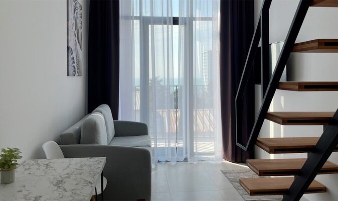 На поезде до ж/д вокзала Сочи, затем на маршрутке № 95, 83, 87 или на автобусе № 19,22 до остановки «Улица Бытха / АТС», затем пройти 51 м до апартаментов.