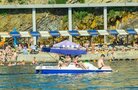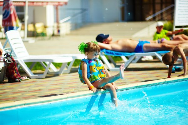 Детская чаша расположена рядом со взрослыми бассейнами. В открытом бассейне особенно любят плескаться дети, для них аниматоры проводят праздники, конкурсы.