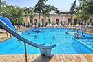 Открытый бассейн санатория «Маяк» с водной горкой, добавляющей развлекательный элемент к оздоровительному времяпрепровождению. Сочетание детской и взрослой зон делает бассейн привлекательным как для семей с детьми, так и для взрослых отдыхающих.
