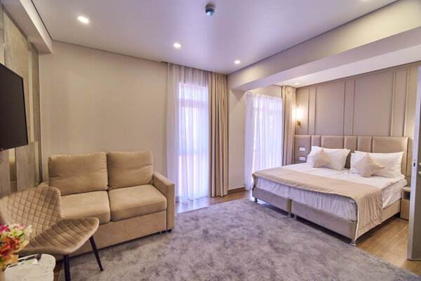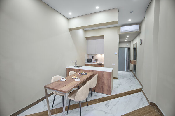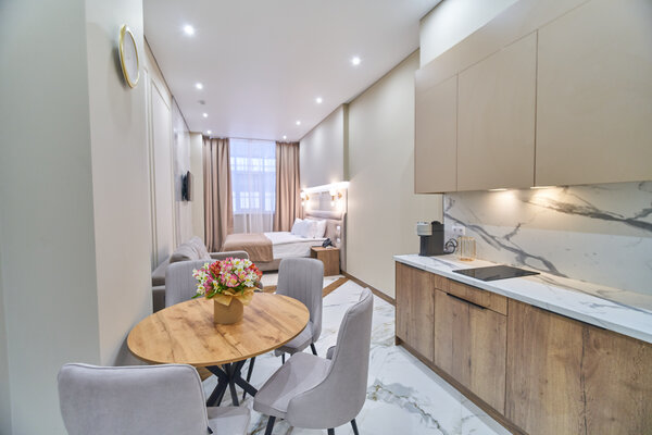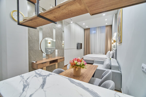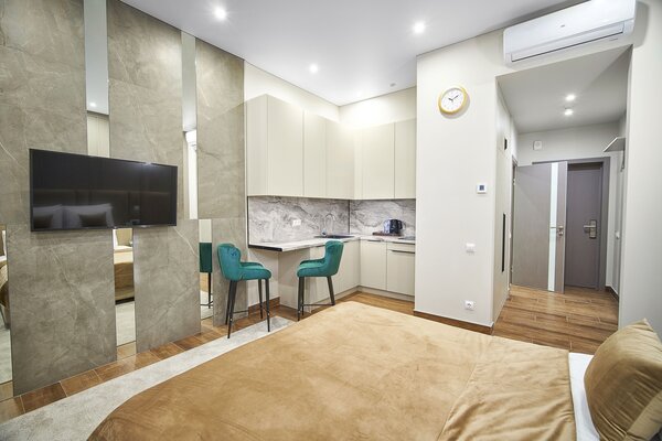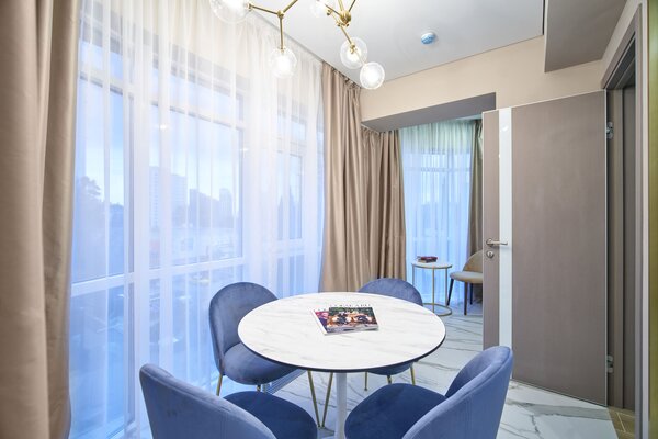Номера оформлены в авторском стиле и отличаются просторностью и комфортом. Сочетая в себе премиум-эстетику и эргономичность, они оснащены кухней с варочной панелью, бытовой техникой и посудой, делая ваш отдых максимально удобным.