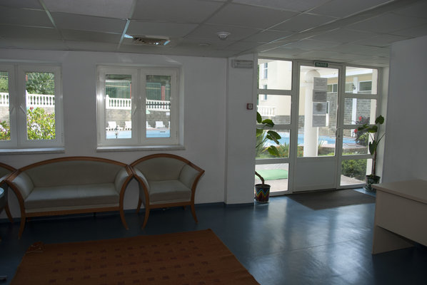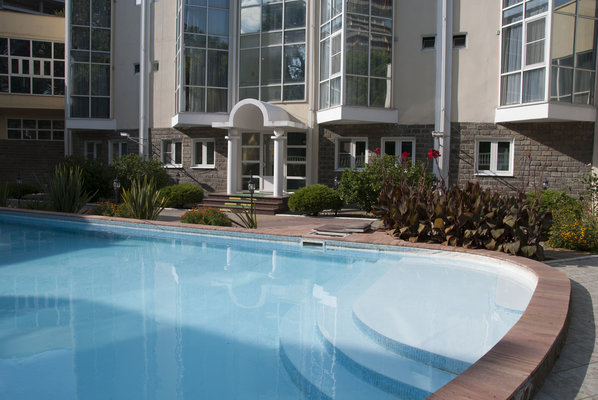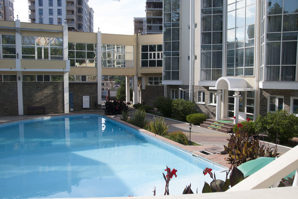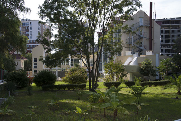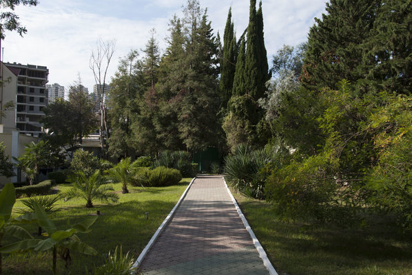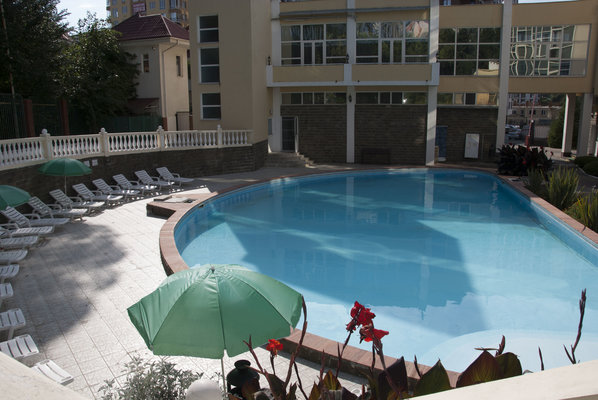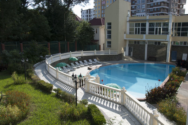 У современного пятиэтажного комплекса своя благоустроенная территория с реликтовыми соснами и субтропической зеленью. В инфраструктуре отеля – сезонный бассейн и сауна, спортплощадка с тренажерами и бесплатная парковка возле корпуса.