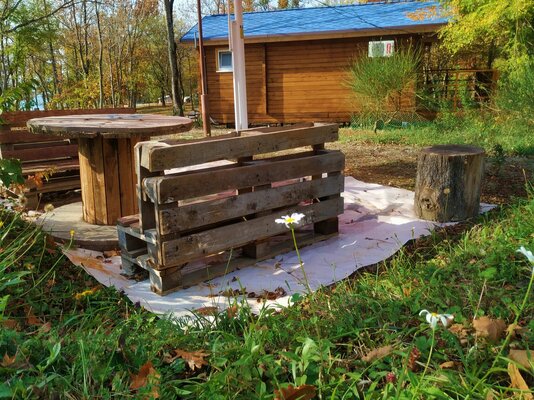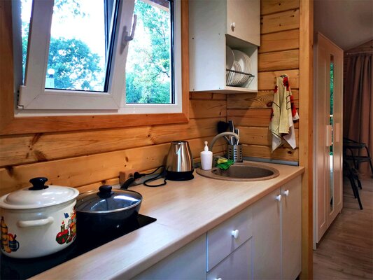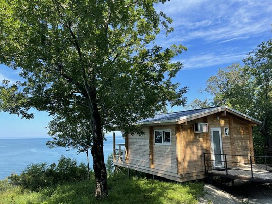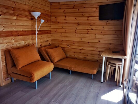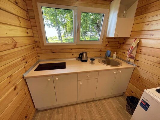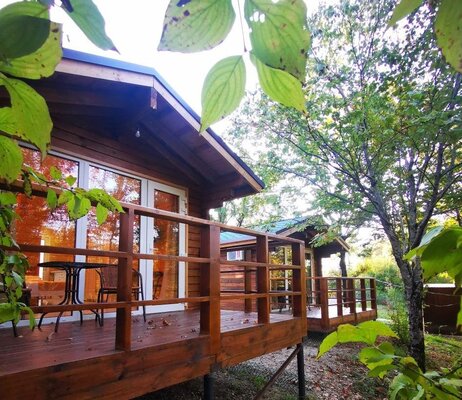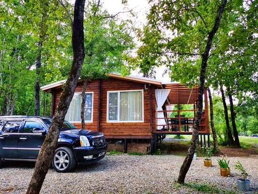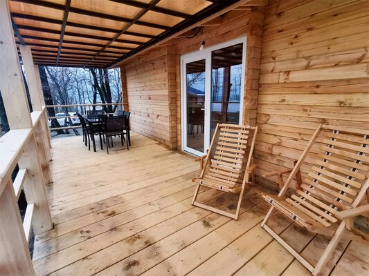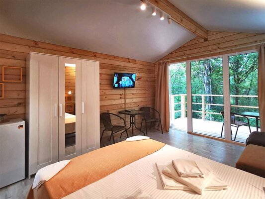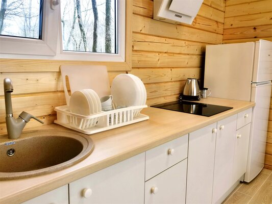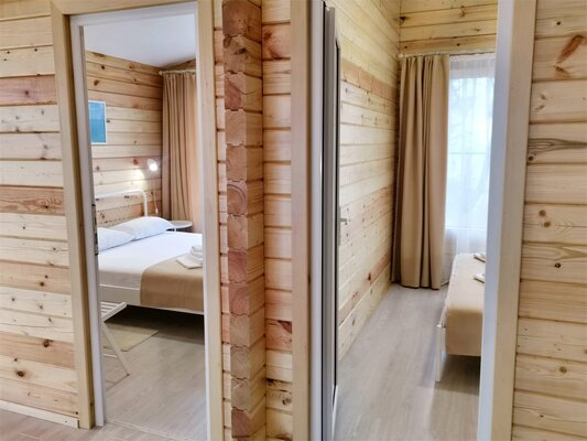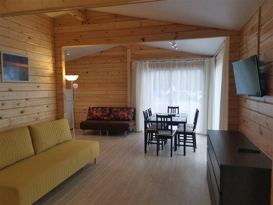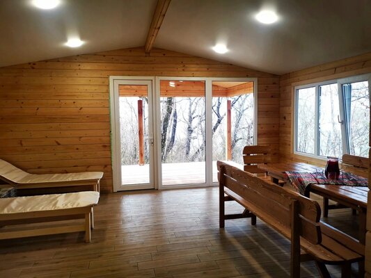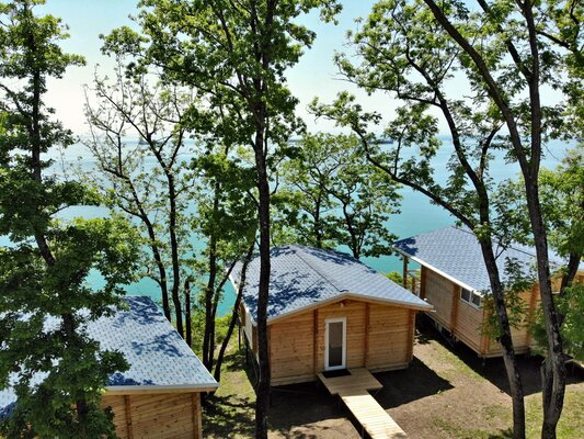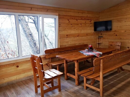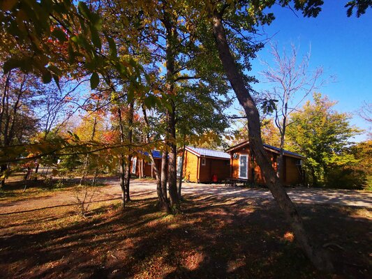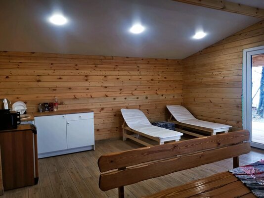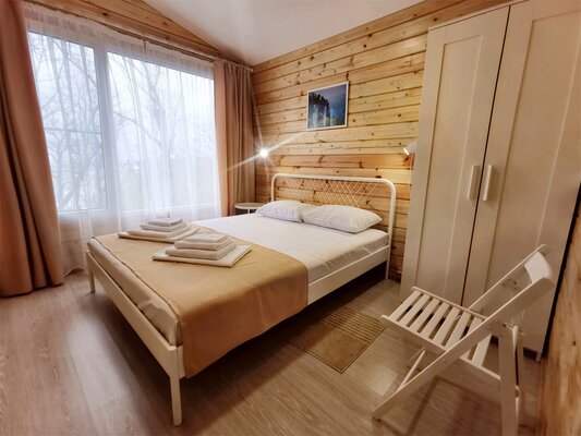 На территории базы отдыха также расположены просторные и уютные деревянные домики, в которых есть все необходимое для комфортного отдыха. В домиках есть кухня с кухонными принадлежностями, гостиная с телевизором и спальня с удобной кроватью.