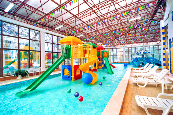 Мелководный сектор для юных курортников предусмотрен и в большом крытом бассейне с минеральной водой, и в открытом бассейне с морской водой. Здесь они активные участники ежедневных спортивных соревнований.