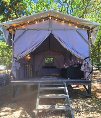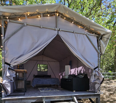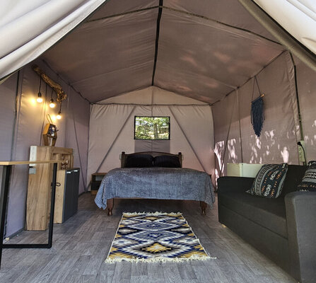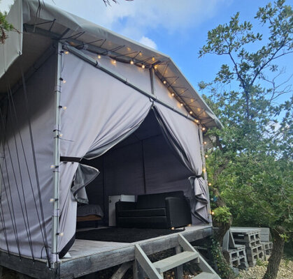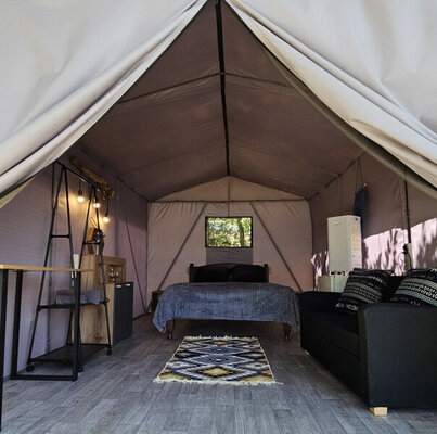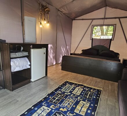 Вы также можете выбрать размещение в одном из наших роскошных сафари-тентов, где вас ждет отдельная зона душевых и туалетов.