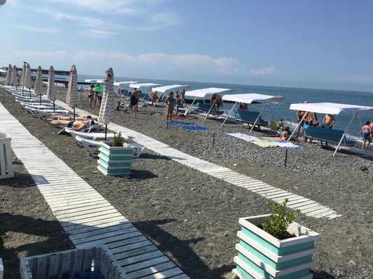 На поезде до ж/д вокзала Адлер, далее на автобусе №558,517,534,550,552 до остановки «Санаторий Южное Взморье», далее пройти 770 м до отеля.