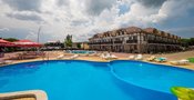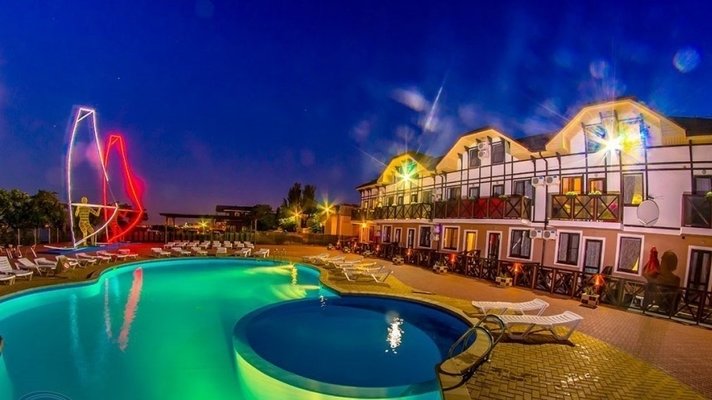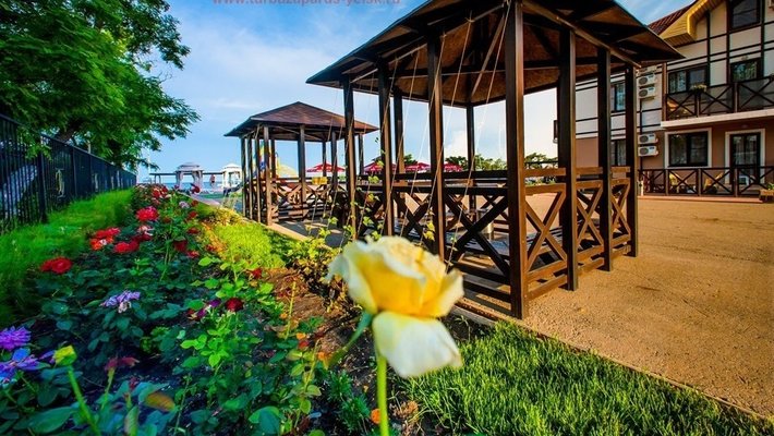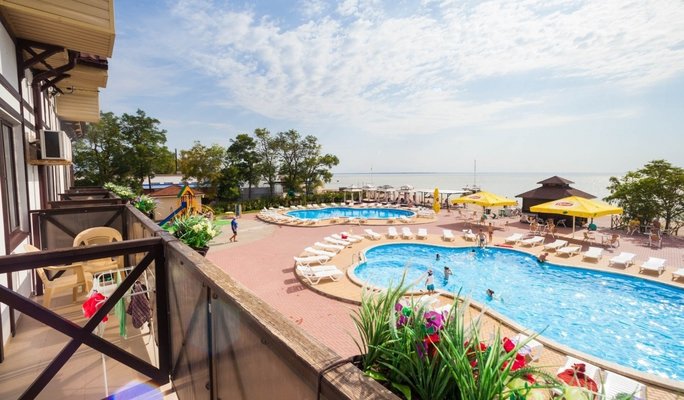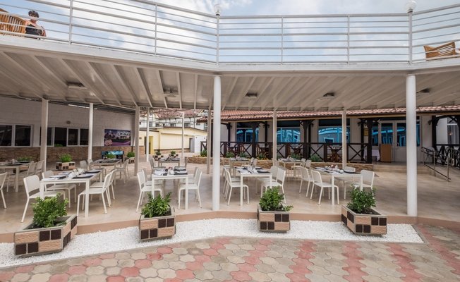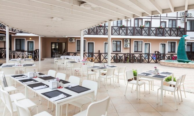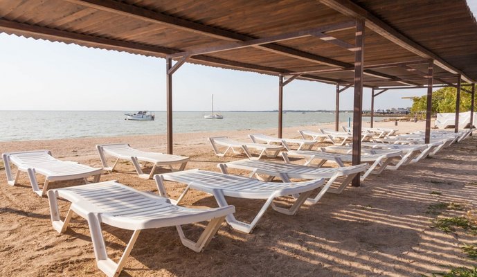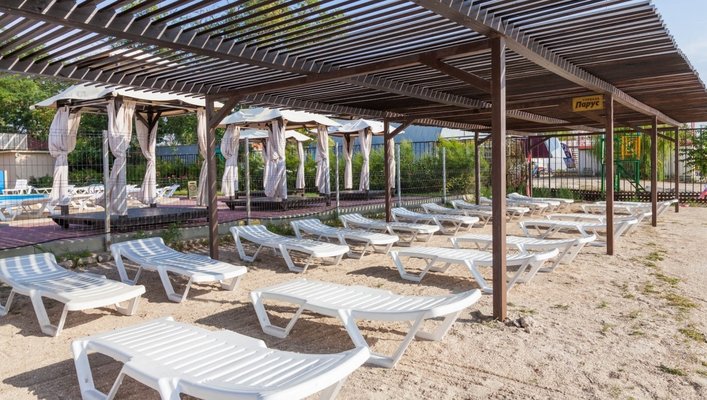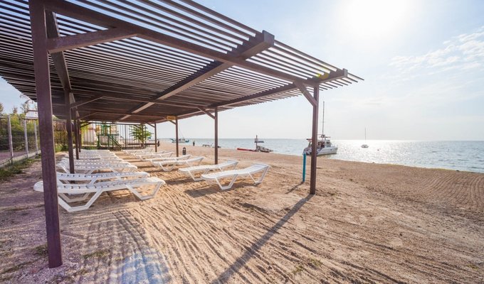 Вход на т/б осуществляется по браслетам с чипом. Внутренняя территория ограждена и охраняется круглосуточно. К услугам гостей бар, кафе, 2 открытых бассейна (с зонами купания для малышей), деревянные беседки, бунгало, шезлонги, теневой навес, собственная парковка, детская игровая площадка, детская игровая комната, непосредственный выход на пляж.