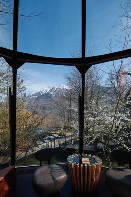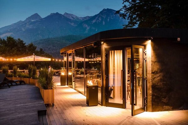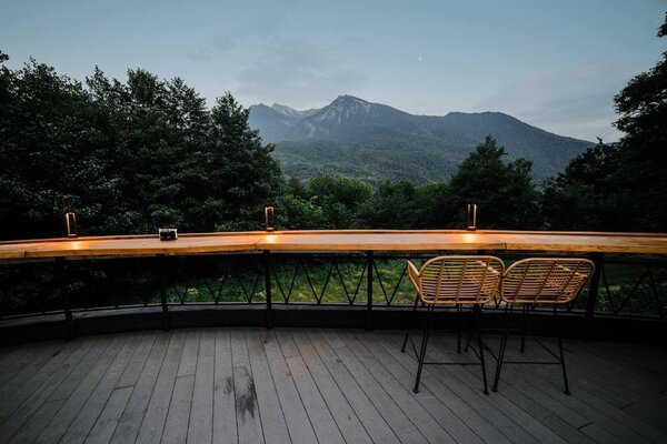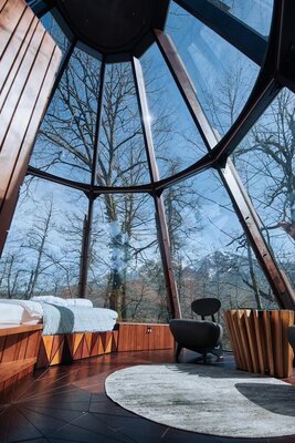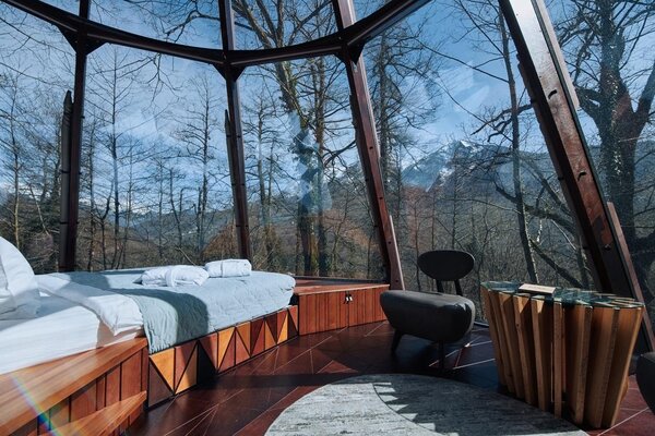 Панорамный кабинет в виде купола открывает вид на зеленый лес и величественные горы. Он расположен в уединенном месте — вы будете защищены от посторонних глаз и сможете спокойно наслаждаться массажем и пейзажами.
