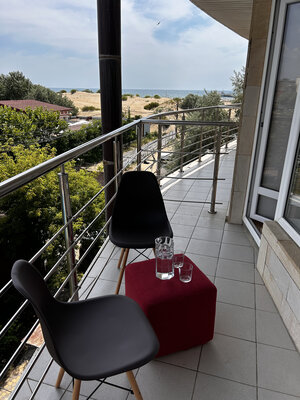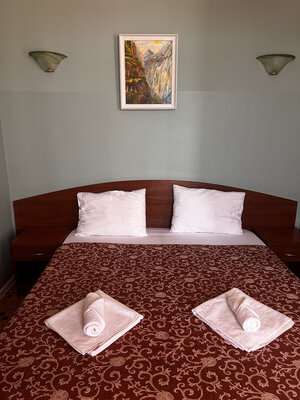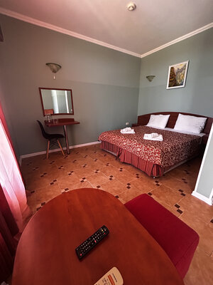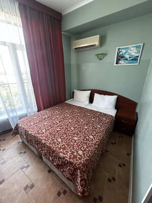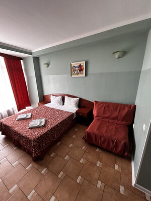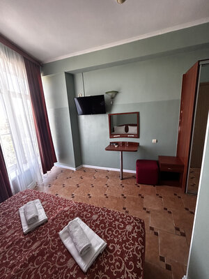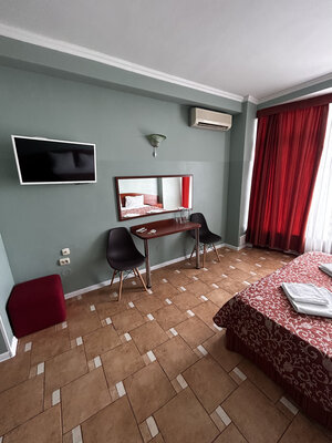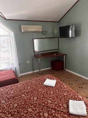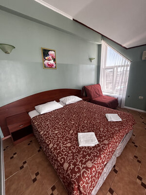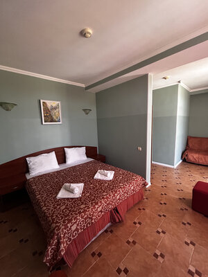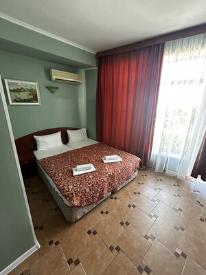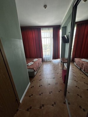 Современный пятиэтажный корпус пансионата возвышается на первой береговой линии, всего в 30 метрах от морского побережья. К размещению предлагаются комфортабельные двух- и трехместные номера с балконами. Каждый номер оснащен автономным санузлом, холодильником, ЖК-телевизором и сплит-системой.