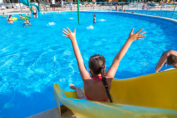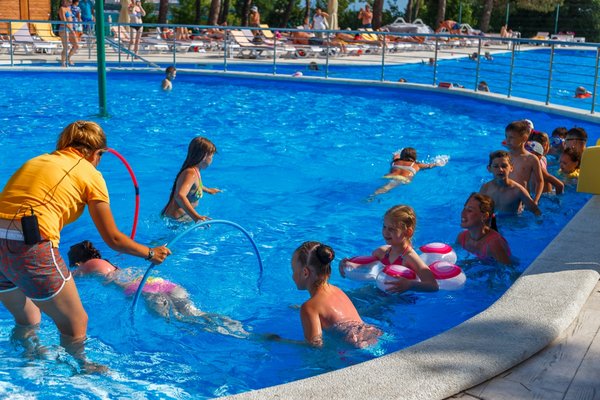 Главный бассейн включает в себя также и специально выделенную зону для детей более старшего возраста. Эта зона оборудована увлекательными элементами, такими как переворачивающиеся ведра, 4 донных гейзера, а также 2 водных горки, предназначенных именно для развлечения и безопасного купания детей.