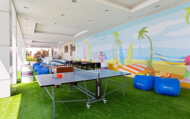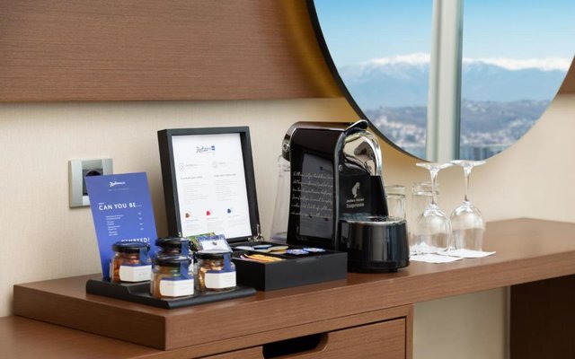По утрам в отеле Radisson Blu предоставляется разнообразный завтрак «шведский стол» с блюдами американской, континентальной и европейской кухонь. Гости могут заказать завтрак навынос или воспользоваться доставкой завтрака по меню в номер. В ресторане Grenadine подают блюда европейской кухни, а в ресторане Mikado — блюда азиатской кухни. В ресторане Anatolian Kebab and Grill готовят фирменные блюда средиземноморской кухни и кухни Среднего Востока. В летнее время также работает бар у бассейна.