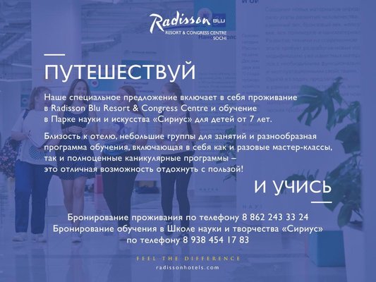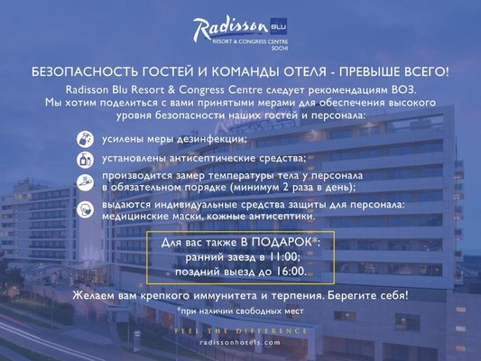 Курортный отель и конгресс-центр Radisson Blu с крытым бассейном, оздоровительным клубом Pace и бесплатным Wi-Fi расположен на побережье Черного моря. В летние месяцы каждые 15 минут от отеля отправляется трансфер до пляжа, расположенного напротив стадиона «Фишт» в Олимпийском парке. Трансфер занимает всего 2 минуты, однако до пляжа можно дойти также пешком. На пляже с шезлонгами и зонтиками есть спортивная площадка.
