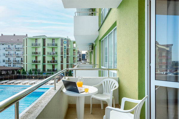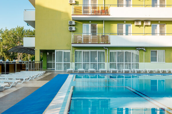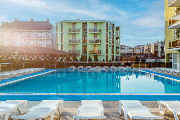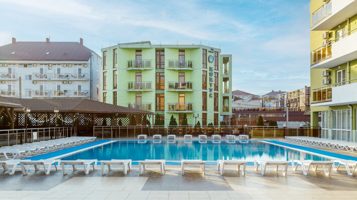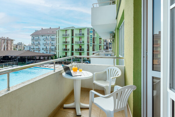 раковина, банные и косметические принадлежности). Из окон открывается чудесный вид на море или лиман, собственный бассейн отеля или на одну из тихих улочек поселка Витязево.