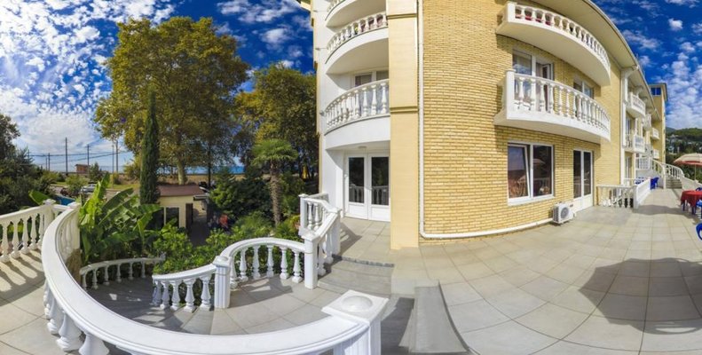 Небольшая, уютная территория гостиницы с декоративными растениями; Терасса со столиками за которыми можно посидеть и отдохнуть с видом на море.