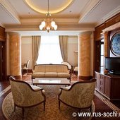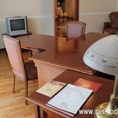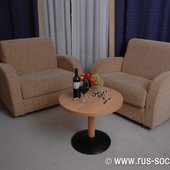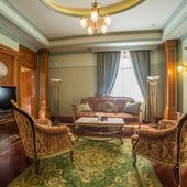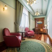 Просторное помещение с витражными окнами, уютными креслами за журнальными столиками идеально подходит для двусторонних встреч и переговоров в узком кругу.