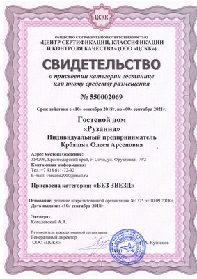 Относительно тихий район расположения гостевого дома «Рузана» Сочи и скромность расценок за расселение в нём — хороший стимул для выбора его в качестве жилья семьями с детьми, романтическими парами, теми, кто хочет бюджетного, но полноценного отдыха в тишине и покое. Гостевой дом «Рузана» принимает гостей круглый год и наличие некоторых удобств в его номерах зависит от цены. Так, в некоторых номерах кондиционеры заменены вентиляторами, а отдельный санузел есть только в номерах повышенной комфортности. Для постояльцев эконом-класса душ, холодильник и туалеты общие, на этаже.
