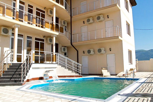 Здесь отдыхающим предоставляются уютные номера со всеми удобствами, из окон которых открывается живописный вид на черноморское побережье и горный пейзаж. На благоустроенной территории имеется большой открытый бассейн, мини-бар с прохладительными напитками, собственное кафе-столовая, а также детская площадка. Имеется бесплатная площадка для парковки автомобилей.