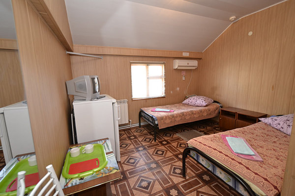 Во второй половине августа каждый год едем на море. В этот раз выбор пал на этот гостевой дом. Номер бронировали заранее в апреле. Для нас обязательные условия: наличие собственной ванной-душевой, первая линия, кондиционер. В данном ГД это все было. Столовой не пользовались. В номере было три односпальные кровати, стол, два стула, холодильник, телевизор, три тумбочки. Жили 7 ночей -...