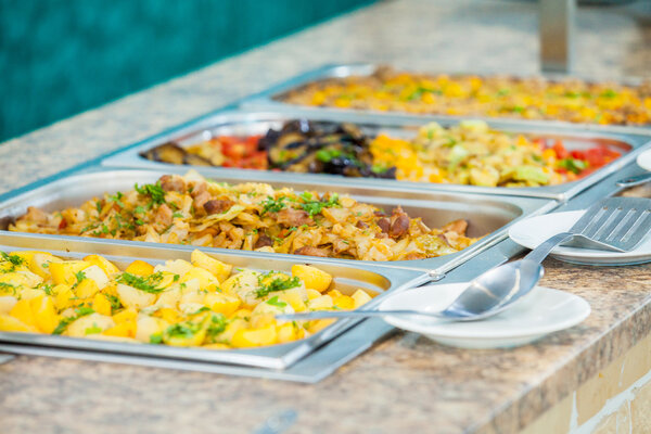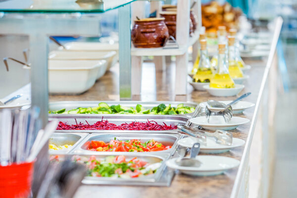 Минимум 4 первых, 4 вторых, 4 вида салатов, несколько гарниров, приправ, соусов, сезонные фрукты, свежая выпечка, соки, морсы, чай, кофе.