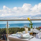 Панорамный ресторан «Фьюжн», расположенный на восьмом этаже отеля, славится своей террасой с великолепным видом на открытое море и Геленджикскую бухту.