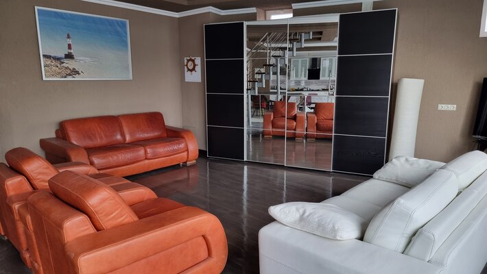 Второй этаж порадует вас просторной гостиной-холлом с кухней, двумя раскладными диванами и кондиционером.
