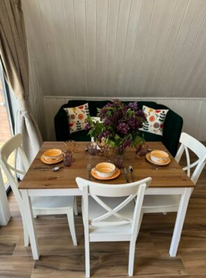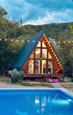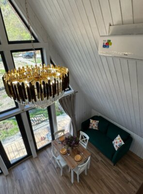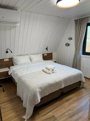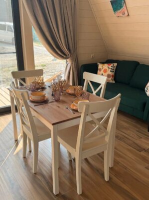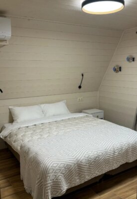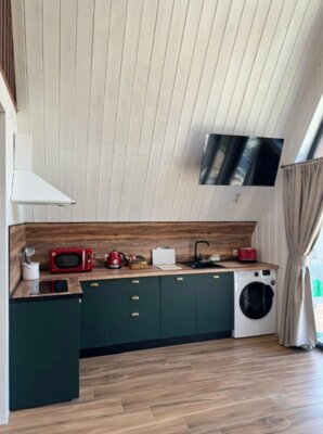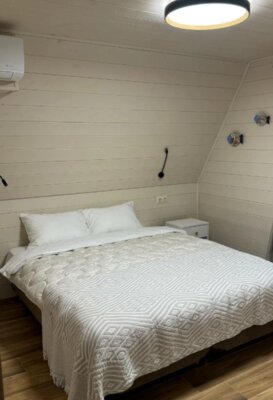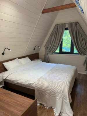 Домики полностью оборудованы всем необходимым: две уютные спальни (одна – на мансарде с панорамным видом на горы), светлая кухня-гостиная с панорамными окнами. К вашим услугам современная техника: кондиционеры, Smart TV, Wi-Fi, стиральная и посудомоечная машины, холодильник, микроволновка, чайник, тостер, фен. Кухонная зона укомплектована для самостоятельного приготовления пищи: посуда, ножи, сервиз на 6 персон, фужеры, турка. Для уюта мы предусмотрели банные полотенца, шампунь, гель для душа, мыло, а также приветственные чай, кофе и горячий шоколад для детей. На территории есть парковка.