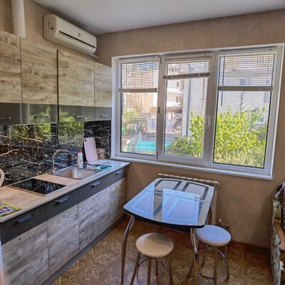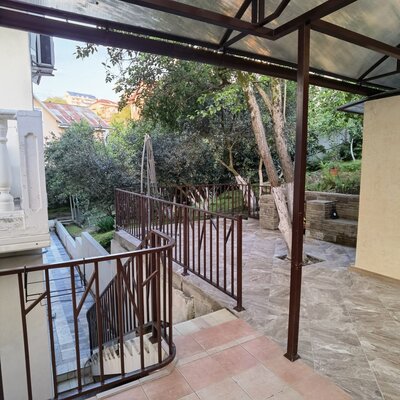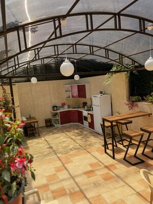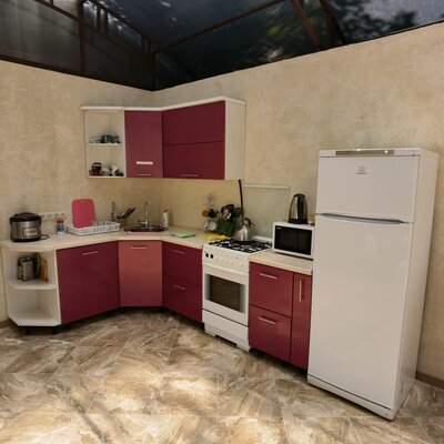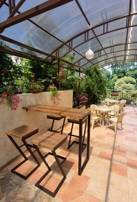 Летняя кухня с обширной террасой площадью 80 квадратных метров, где можно пообедать под виноградной лозой и насладиться пением птиц. Кухня оборудована всей необходимой посудой и техникой для приготовления пищи: холодильником, плитой и духовкой, микроволновой печью, чайником и мультиваркой