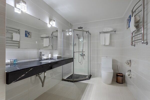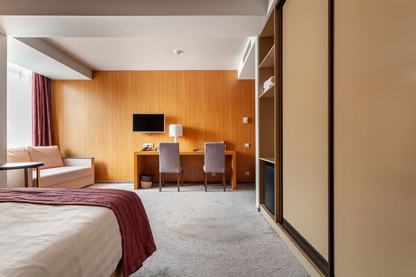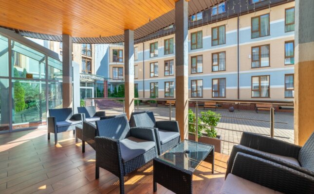 Гостей ждет современный четырехэтажный корпус, возвышающийся на закрытой благоустроенной территории и оснащенный бесшумным лифтом. К размещению предлагаются комфортабельные однокомнатные номера категорий Стандарт, Джуниор Сюит, Сюит Синьор и Премиум Люкс. Каждый номер отличается простором, светлым интерьером, современной мебелью и оборудован ванной комнатой, где предусмотрены все необходимые туалетно-косметические принадлежности, а также халаты и тапочки для максимального комфорта. Во всех помещениях функционирует современная система вентиляции.