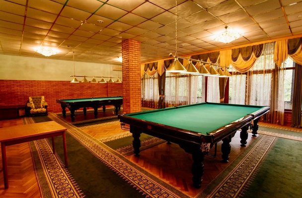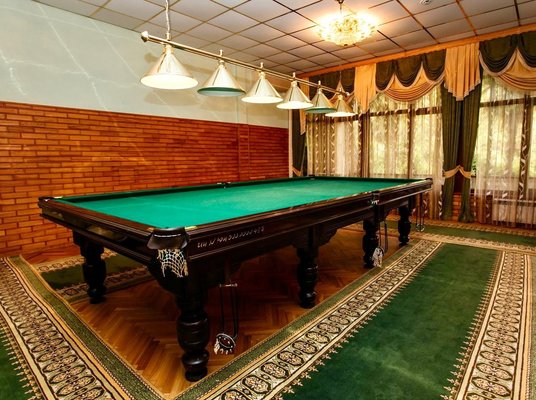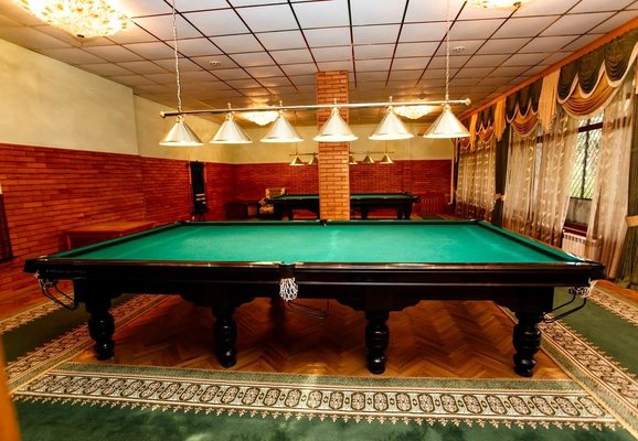 Первый зал оснащён одним, второй — тремя столами для игр в русский и американский бильярд. Помимо изящных потолочных люстр, для удобства игроков над столами расположены светильники-подвесы. Аксессуары и оборудование высокого класса и новейшего состояния порадуют даже самых опытных и взыскательных поклонников бильярда.