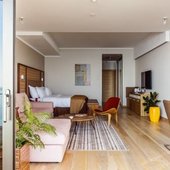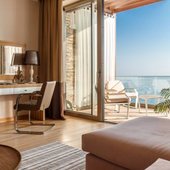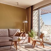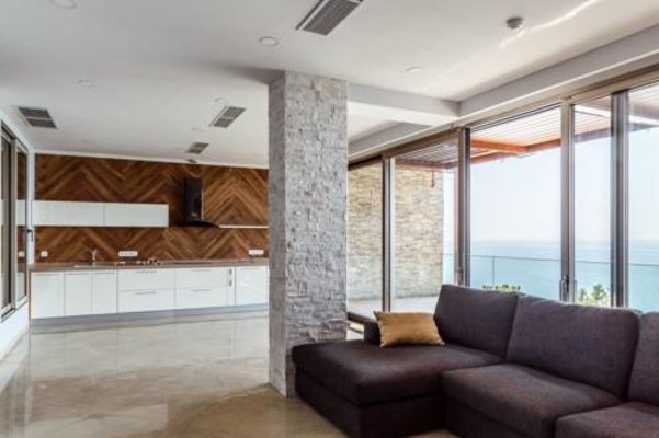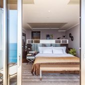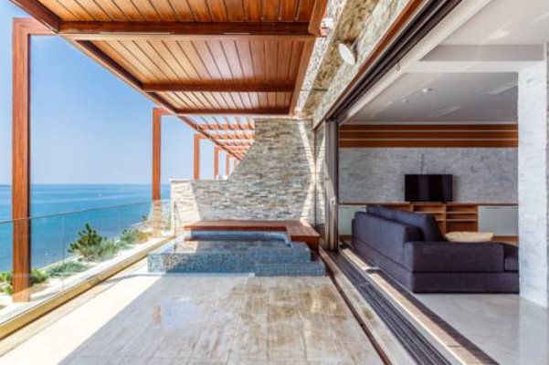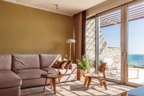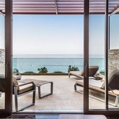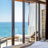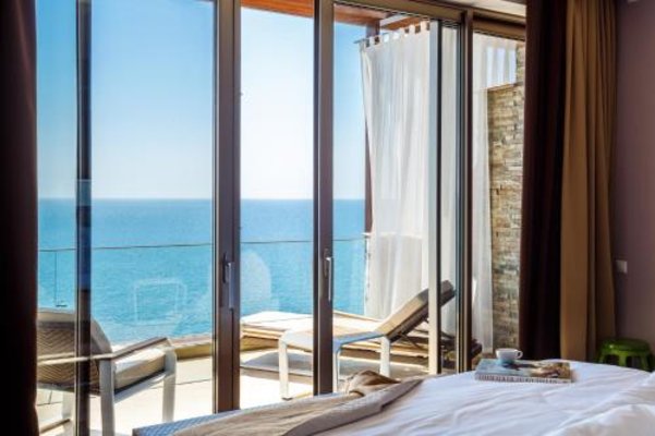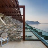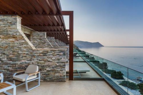 Трехэтажное здание со стеклянным фасадом, буквально встроенное в скалистый выступ, включает всего 28 номеров, каждый из которых обращен к морю и открывает морскую панораму, достойную кисти художника.