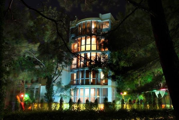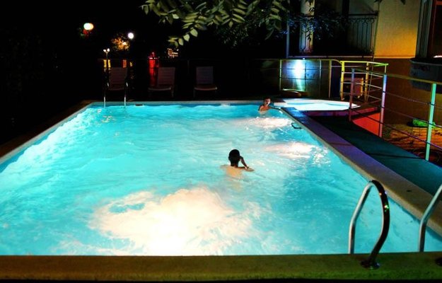 Общая территория комплекса – 5,2 га. На территории расположен мини аквапарк из трех бассейнов. Площадь бассейна для взрослых – 162 м2 (18 м х 9 м), детские бассейны совмещены – 107 м2 (12м х 6 м и 4м х 8м). Вода в бассейнах обычная, подогрев во всех чашах.