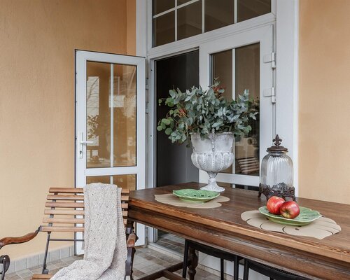Роскошная главная спальня с собственной ванной комнатой, а также две просторные спальни с отдельными террасами и общей ванной комнатой. Полностью оборудованная кухня из массива темной древесины, создающая неповторимую атмосферу. Интерьер виллы украшен уникальными предметами антиквариата, превосходной мебелью в венецианском стиле и эксклюзивными произведениями искусства XX века.