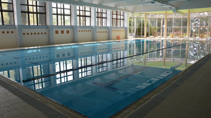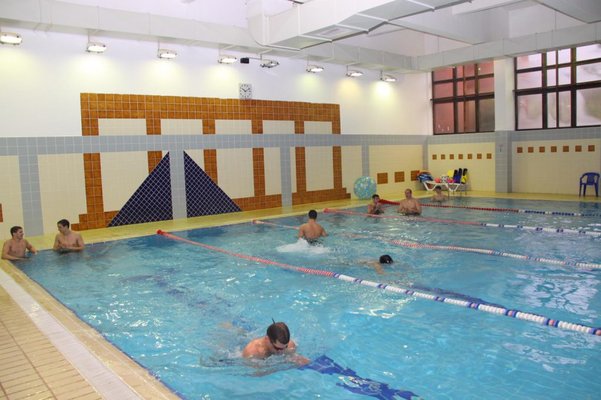 крытый — 5 дорожек. Размер бассейна: 25х13,5м. Глубина от 1,2 до 2,0м. Подогреваемый.