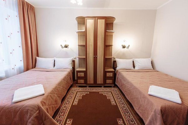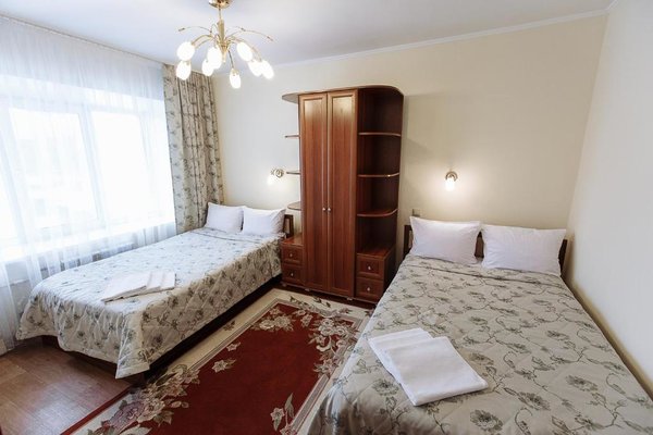 Поездом до ж/д вокзала г. Ачинска, далее далее на автобусе №1, 9 до остановки «Колледж отраслевых технологий и бизнеса», или на автобусе №3, 7, 8, 21 до остановки «Декабристов», далее 150-500 м до гостиницы.