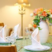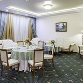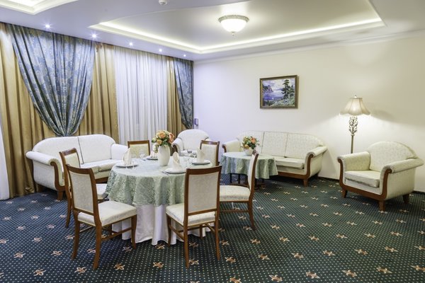 На территории работает ресторан «Сибирь» на 100 персон и три кафе. Каждое утро накрывается завтрак в формате "шведского стола".