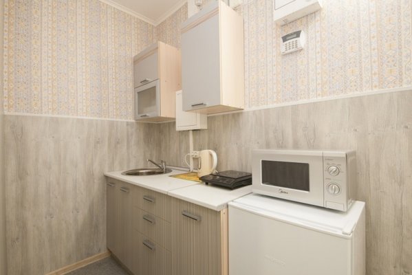 Мини-кухни оснащены всей необходимой бытовой техникой, посудой и столовыми принадлежностями.