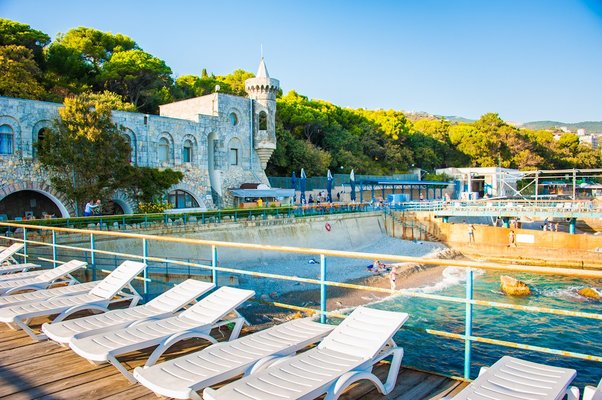 Пляж арендуемый в 3 минуты на микроавтобусе по графику, или пешком, 10-15 минут через Мисхорский парк.
