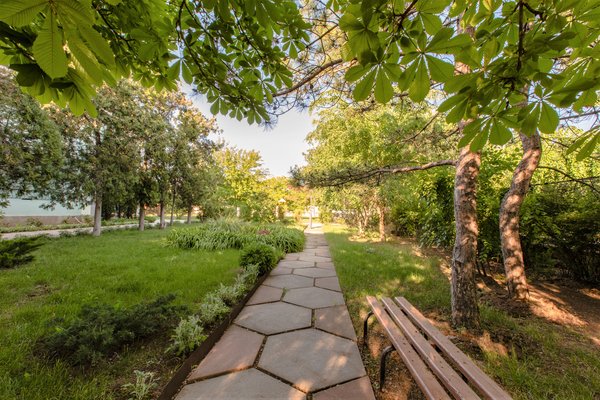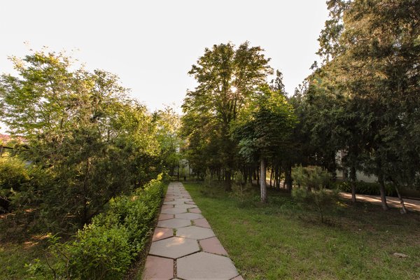 Территория пансионата огорожена и благоустроена. Там находится автостоянка, детская площадка, столовая, библиотека. У представителя туристической фирмы можно заказать экскурсии по городу и по Крыму, дегустацию крымских вин. Рядом с пансионатом расположена сеть магазинов (продовольственные и сувенирные), городской парк им. Франко.