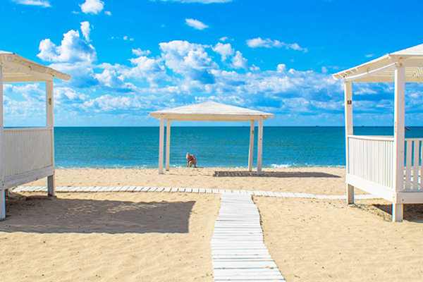 Самолетом до аэропорта г. Симферополь, далее рейсовым автобусом или маршрутным такси до автовокзала г. Евпатория; далее маршрутное такси № 6, 10 до остановки "Почта".