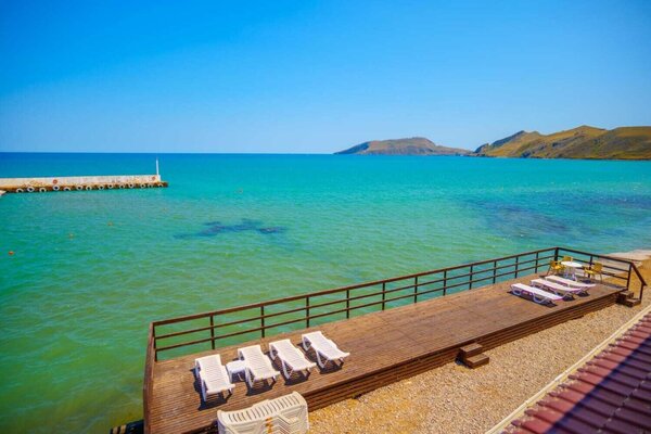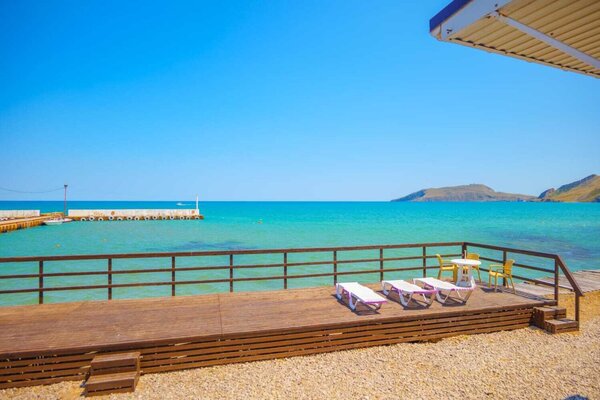 При гостинице есть собственный пляж с лежаками, уютный и относительно безлюдный. Вокруг красота, горы, чистейшее море – идеально! На территории расположены два кафе и магазин, где можно покушать и приобрести всё необходимое.