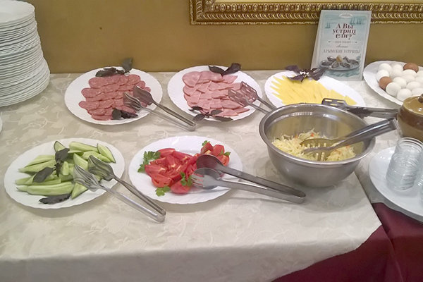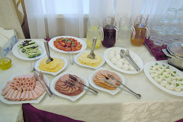 Основной ресторан — в корпусе, европейская кухня, время работы: завтраки с 8.00-10.00, обеды с 13.00-15.00, ужины с 18.00-20.00