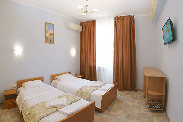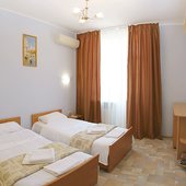 Самолётом до г. Симферополя, далее из аэропорта рейсовым автобусом до автовокзала г. Евпатория, далее – на городском маршрутном такси №8, остановка «Сауна», от остановки до гостевого дома -150 м