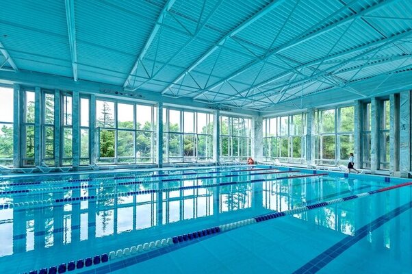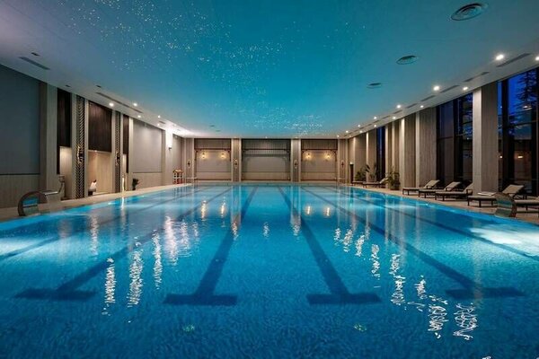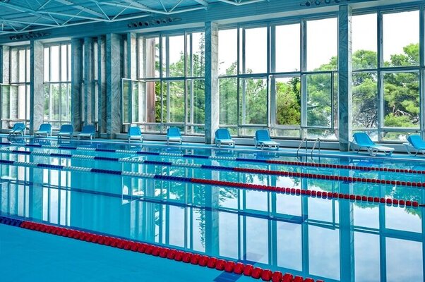 Пользование бассейном с панорамными окнами входит в стоимость проживания. В бассейне проходят занятия по аквафитнесу, проводятся персональные тренировки по плаванию для детей и взрослых.