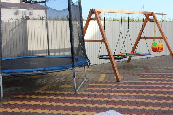 На территории есть развлечения для детей: детский батут, качели, бассейн.