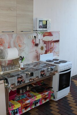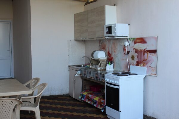 В гостевом доме работает летняя кухня для самостоятельного приготовления пищи. В кухне есть электрическая плита и духовой шкаф, микроволновая печка, есть вся необходимая посуда и столовые приборы.